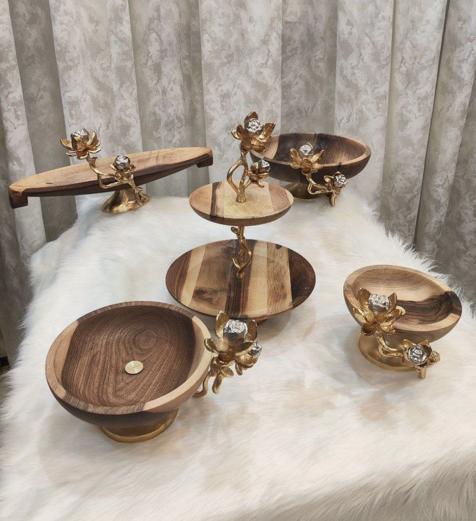 طقم 5 قطع من الورد الأحمر. مادة العمل ألومنيوم. الأواني مصنوعة من خشب الجوز. لون العمل مطلي بالذهب مع ضمان. ارتفاع جميع القواعد 10 سنتيمترات. كل واحدة تعبأ بشكل فردي في كرتون، وبشكل عام في كرتون أم واحد. الوزن الكلي للطقم 4 كيلوغرام.